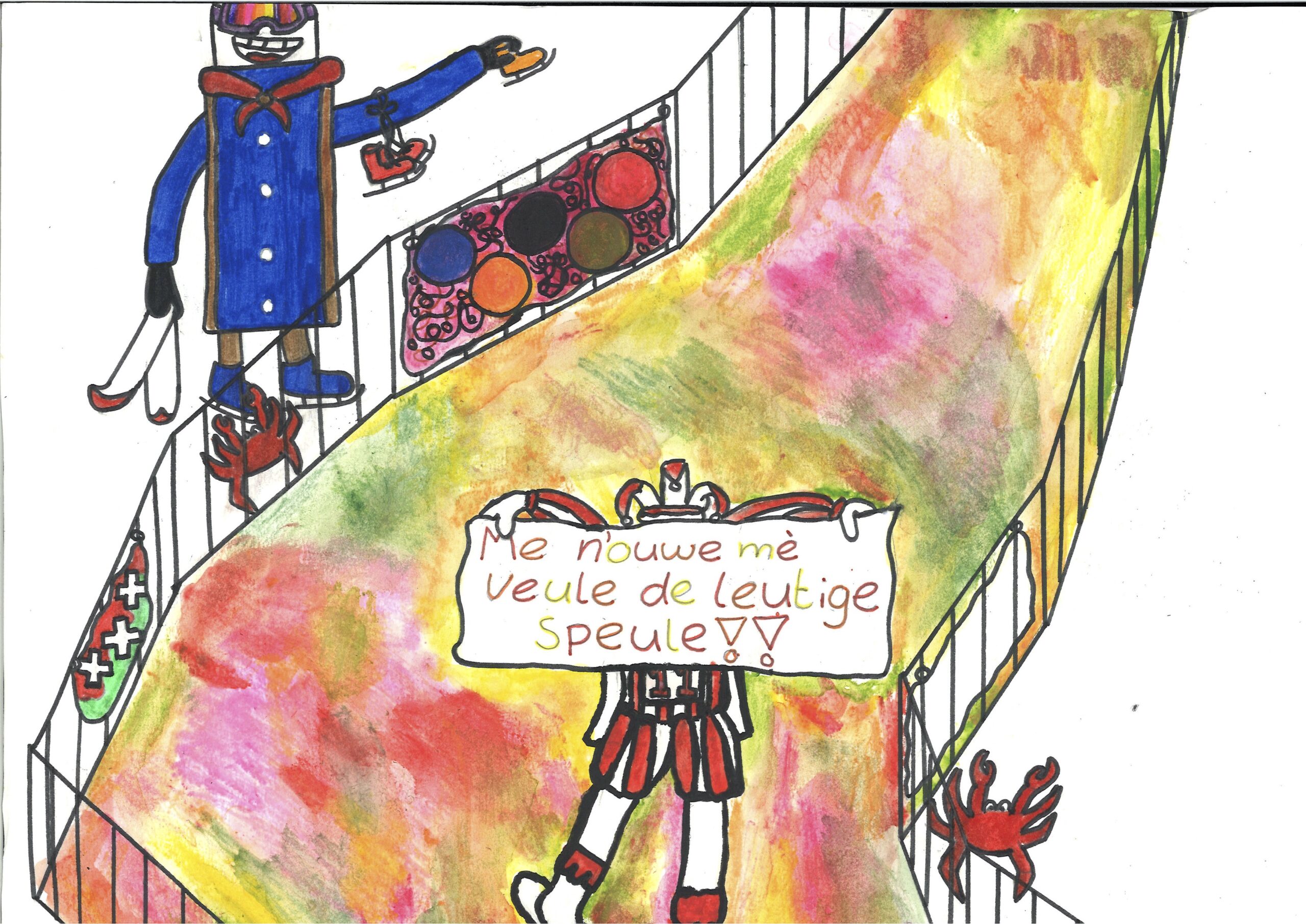 De leerlingen van de Art Fusion klas gingen aan de slag met het motto van 2026: Me n’ouwe mè veule De Leutege Speule. Ter voorbereiding werd er in het Markiezenhof een bezoek gebracht aan de werken van Louis Weijts. De kunstenaar die de Vastenavend zijn huisstijl heeft gegeven.